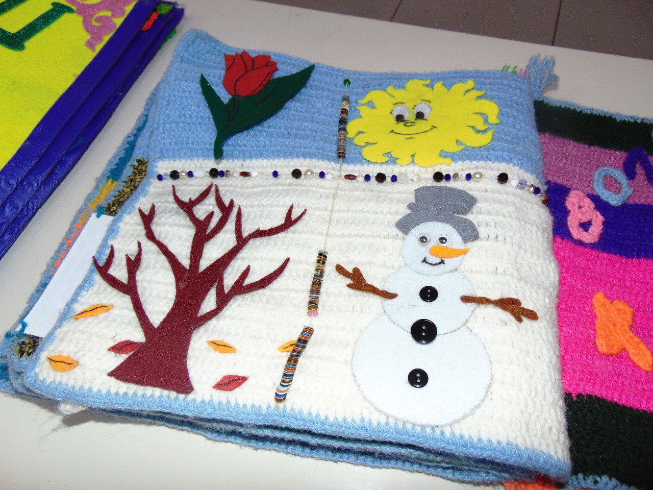There’s even a trilingual crocheted edition of Abai’s The Seasons, in Kazakh, Russian, and English. Its pages include trees, snowflakes, flowers, and ladybugs, all detachable and fastened with buttons. Children can “switch” winter to spring, collect leaves, or “scatter” snow, transforming play into reading.