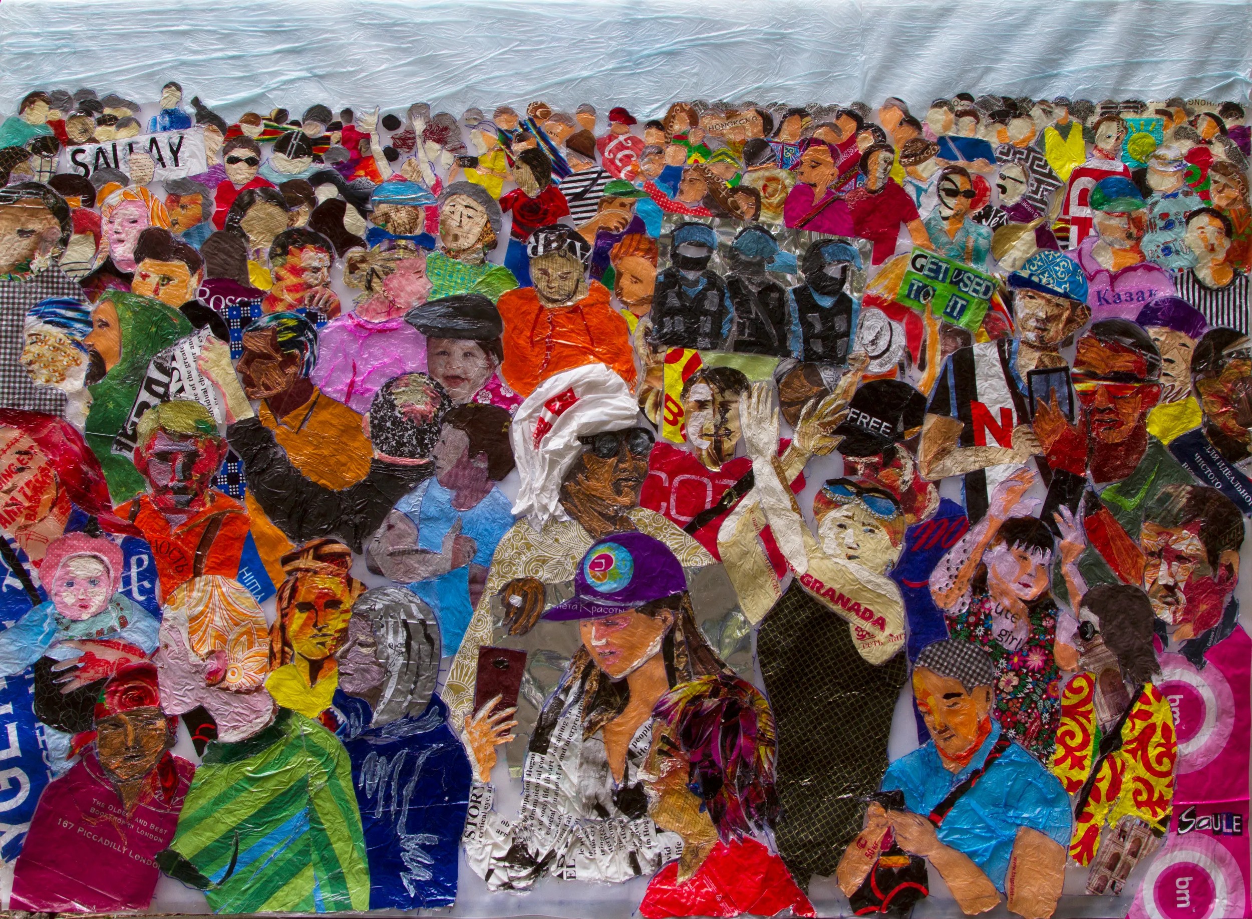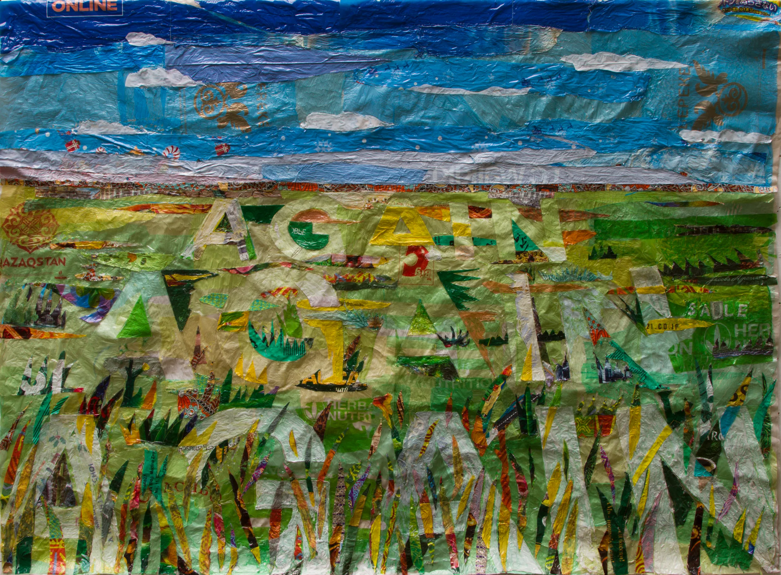 Suleimenova: I found this bag, a plastic bag with little plastic bags inside my mother’s home, and found that I had enough amazing colors there. For several years, I was trying to find a way to glue them, not to use any paint at all. The problem is that polyethylene and polymers are very hard to glue to each other, and there is only one way, which is at a high temperature.