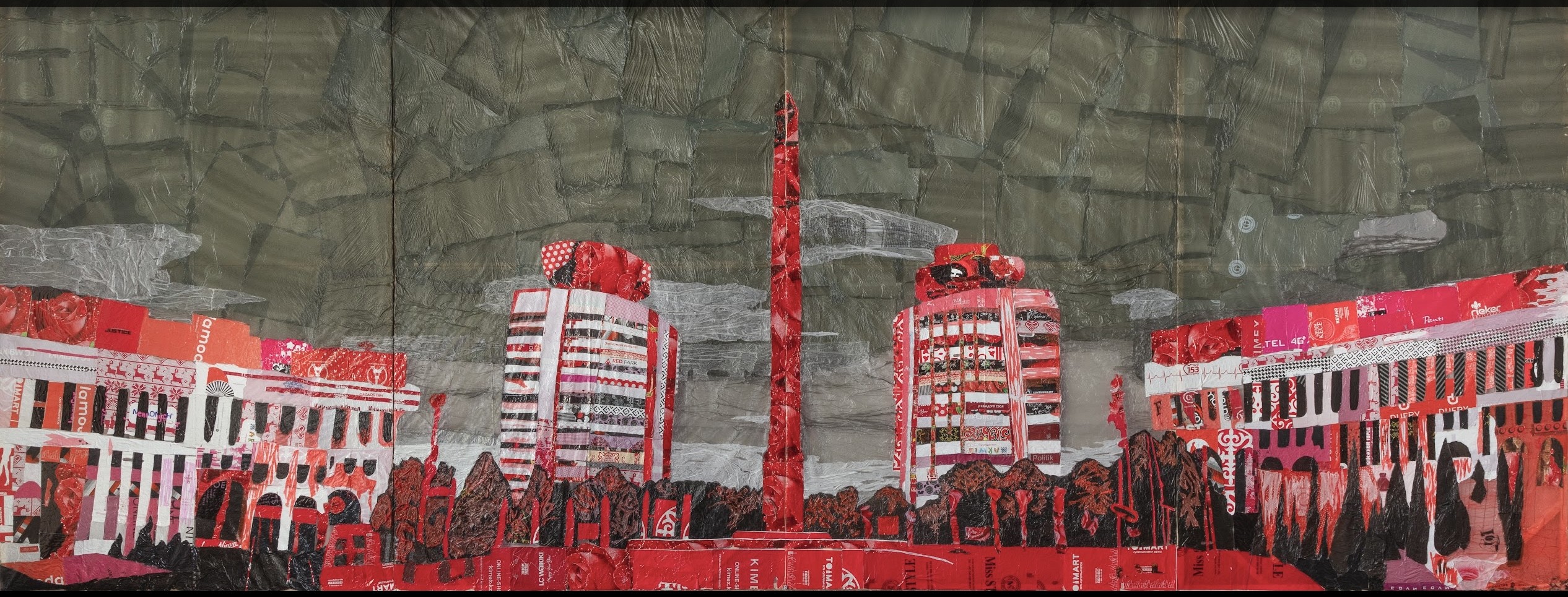 An example is her ongoing series, Cellophane Paintings, composed entirely from used plastic bags, transforming everyday waste into luminous, layered pictorial fields that hold together subjects as vast as socio-political trauma, from the Kazakh famine of 1930–1933, human rights violations, Karlag, one of the largest Gulag labor camps, and the Uyghur genocide. Those heavy themes are associated with some that are more intimate: family members, flowers, and cityscapes.